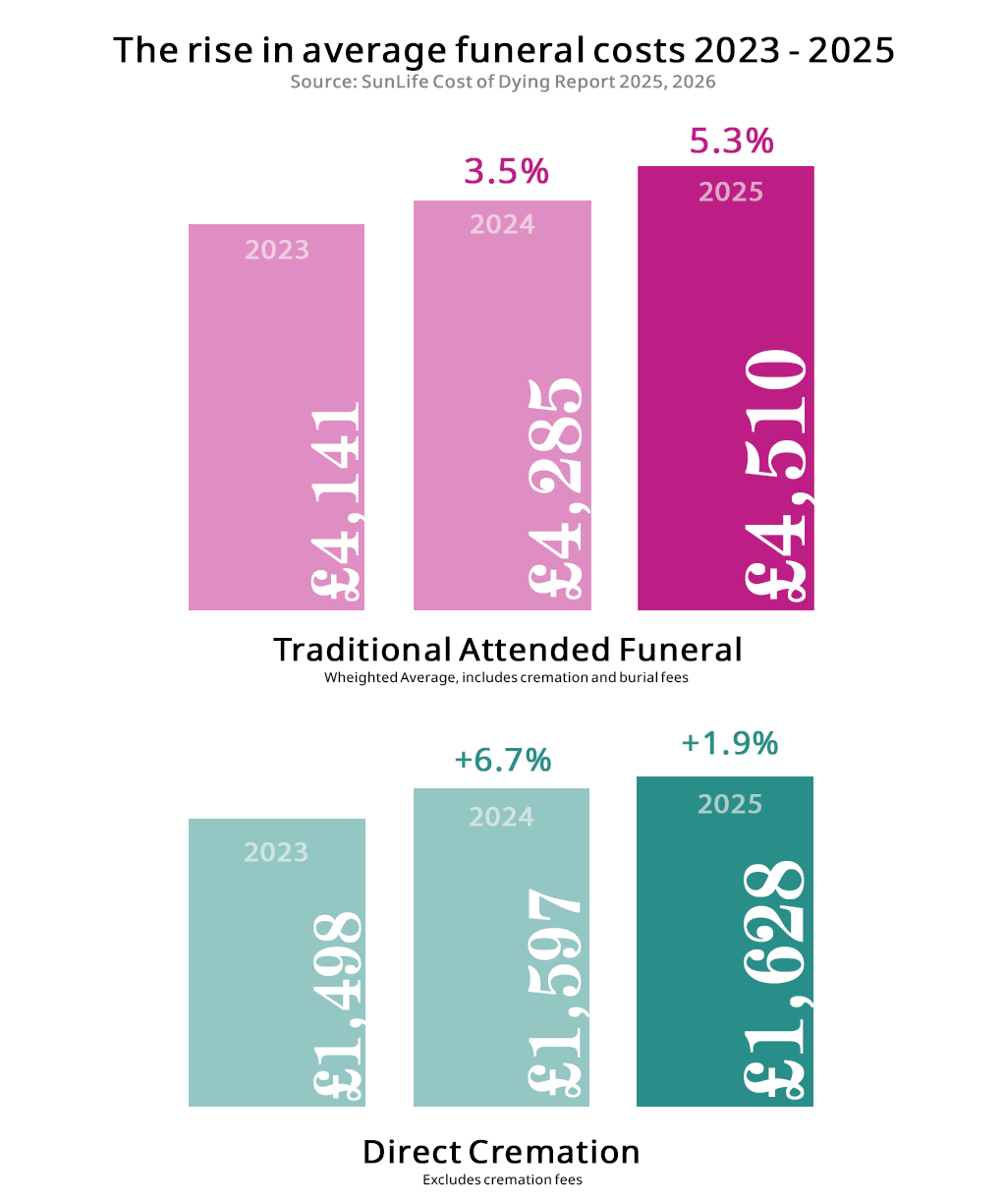 According to the SunLife Cost of Dying Report 2026, the total average cost of a traditional attended funeral in 2025 was £4,510, 5.3% more than 2024, and almost £400 higher than 2023.(Weighted average, the cost of funeral director services, burial and cremation fees included)